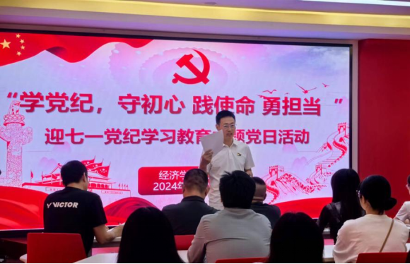 在这里,学院党委书记郭晋南为全体党员讲授了一堂生动的党课。郭书记以典型违纪案例警示教育开篇,警醒各位党员以身作则,坚守初心,时刻保持警惕。他强调,党员同志必须积极学习党的先进思想,才能确保我们党始终走在时代前列,始终成为全国人民的主心骨,始终成为坚强的领导核心。他结合党的历史、党的理论和党的实践,深入浅出地阐述了党的纪律和规矩的重要性,以及作为党员应该具备的责任和使命。随后,新党员代表、经济学教研室夏宇同志做了发言。他说,作为一名新党员,一定要加强党的理论学习,以优秀党员的标准要求自己,坚持不懈,不忘初心,知行合一,平凡踏实,努力践行为人民服务的宗旨!